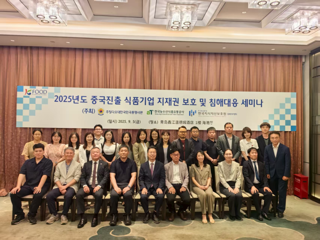 9月5日,由驻青岛大韩民国总领事馆、韩国农水产食品流通公社(aT)、韩国知识产权保护院东北亚IP中心联合主办的“2025年进军中国市场的食品企业知识产权保护及应对研讨会”在青岛鑫江温德姆酒店成功举办。