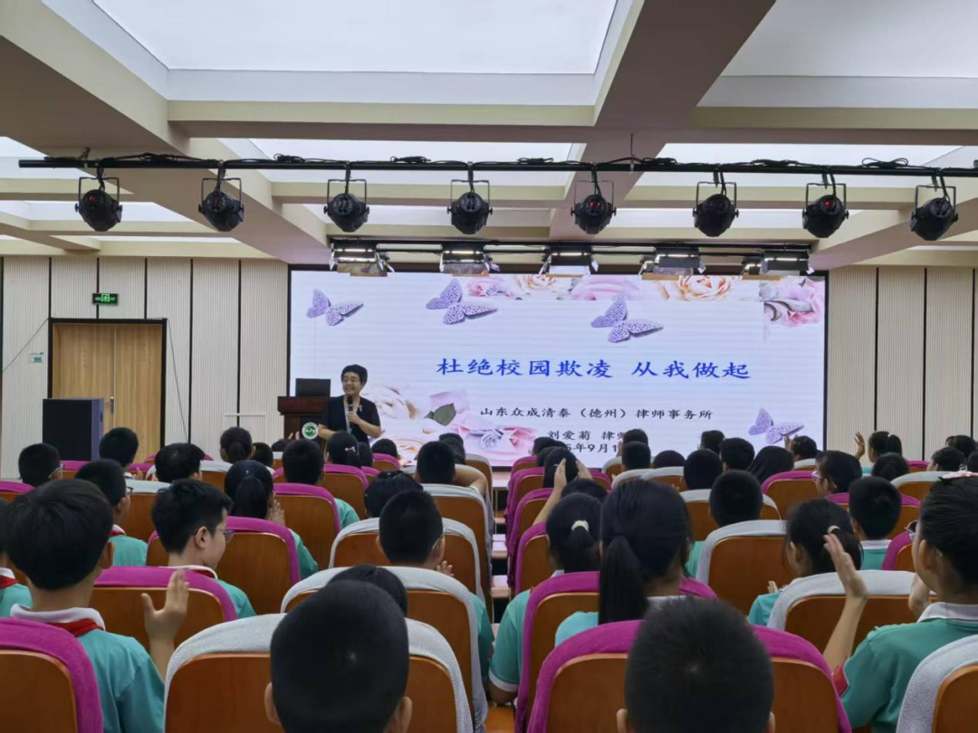 9月11日,山东众成清泰(德州)律师事务所合伙人刘爱菊律师应邀为德州市铁西南路小学五年级学生开展《拒绝校园欺凌 从我做起》专题普法讲座。