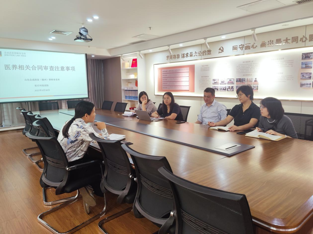 团队成员结合丰富的实践经验,详细阐述了在诉讼过程中需要重点关注的法律问题。从举证责任分配到医疗过错认定标准,从损害后果与医疗行为因果关系的判定到赔偿项目的计算,以案例为切入点,深入剖析了在诉讼中可能面临的各种法律风险,并提出了针对性的应对策略。在医疗纠纷预防和处理方面,重点关注以下几个方面:精准辨析及明确损害后果、认真研判并积极参与听证、全面系统梳理病历、多因一果案件的风险防范、积极调解、积极督促判决履行。 在合同审查方面,团队成员从合同主体资格、合同标的、内容合法性、合同具体条款等方面入手,详细汇总了在审查医养相关合同时应当注意的问题。重点关注以下几个方面:明确合同主体,把好“交易准入关”;明确权利义务,筑牢权责的“清晰边界”;审慎使用违约责任,促使双方积极诚信履约。 众成清泰德州所医疗团队将继续加强业务交流和培训,不断提升专业能力和服务水平,不断为客户提供更优质化的法律服务。