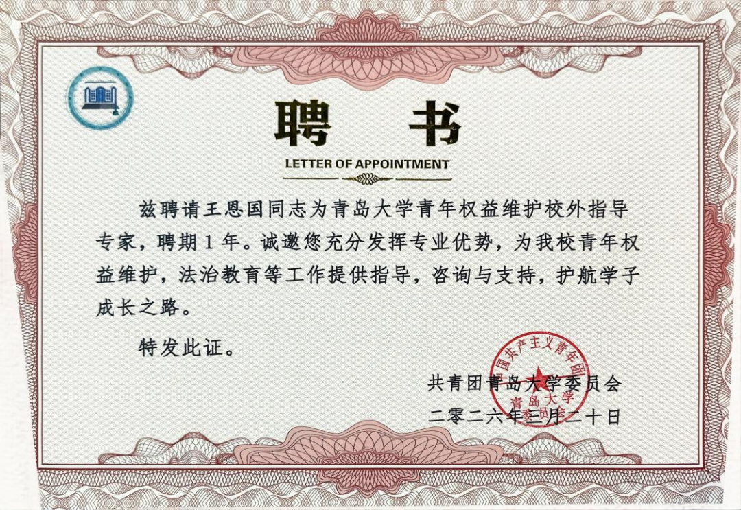 青年兴则国家兴,青年强则国家强。青年学子的健康成长,离不开坚实的权益保障与科学的法治引导。近日,共青团青岛大学委员会正式举行聘书颁发仪式,聘请众成清泰西海岸所执行主任王恩国担任青岛大学青年权益维护校外指导专家,聘期为一年。