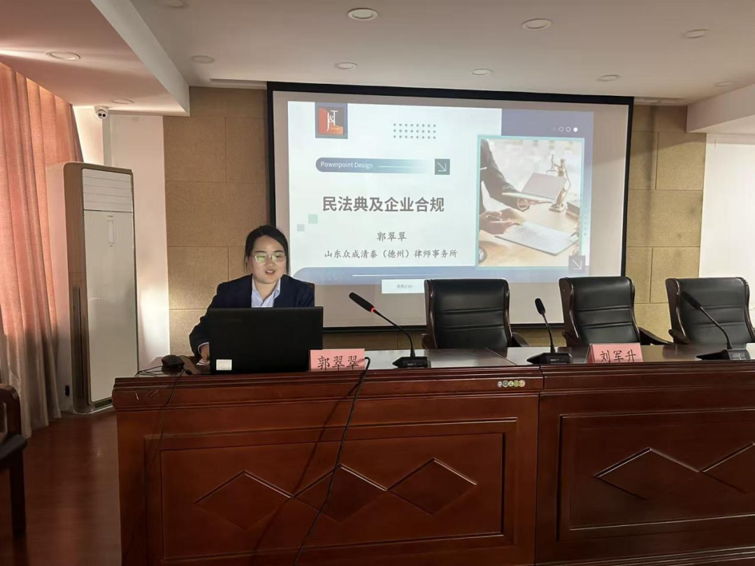 吕玉健律师以《海关高级认证与两用物项出口管制合规管理》为题,系统地解读了海关AEO认证的制度要点与实务操作,并结合当前出口管制政策,帮助企业厘清合规边界、识别风险点,为企业“走出去”提供切实可行的合规指引。 郭翠翠律师以《民法典及企业合规》为题,围绕民法典概述、企业合规体系建设、合同订立、履行、变更与解除等八个方面展开系统讲解。她结合典型案例,深入剖析了合同文本漏洞、履约监管盲区、权责约定模糊等企业高频法律风险点,从民法典的视角为企业厘清风险防控路径,并针对性地提出合规经营的具体建议,助力企业在法治轨道上实现稳健发展。 本次专项培训,两位律师从不同维度为企业深入解析了合规经营的重要性。吕玉健律师立足涉外贸易前沿,系统梳理了海关AEO认证的制度要点与出口管制合规红线,帮助企业构建国际化经营中的风险“防火墙”;郭翠翠律师则聚焦企业日常经营,围绕民法典核心要义,逐一剖析合同管理、权责约定、履约监管等环节的高频法律风险,为企业提供了可操作、可落地的合规建议。两位律师的授课互为补充,既有宏观视野,又有实务深度,从“走出去”的涉外合规到“沉下来”的内部治理,全方位为企业厘清了合规经营的逻辑主线,助力企业在法治护航下行稳致远、实现更高质量的长远发展。 未来,众成清泰(德州)律师事务所将继续秉持“专业高效、务实担当”的理念,持续深入企业一线,为客户提供更加精准、优质的法律服务,为企业合规经营与高质量发展保驾护航。