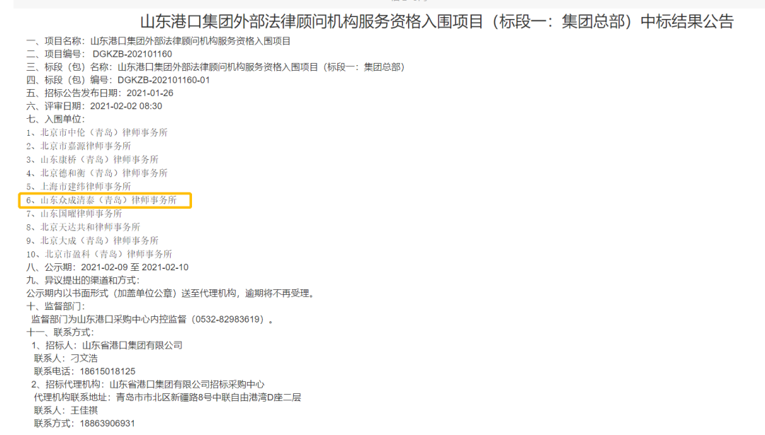 2021年2月9日,山东港口集团公布了外部法律顾问机构服务资格入围项目中标结果,山东众成清泰(青岛)律师事务所组参与投标并成功入围集团总部标段。