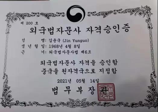 律师荣誉 | 众成清泰金允国律师获得韩国“外国法咨询师”资格证书