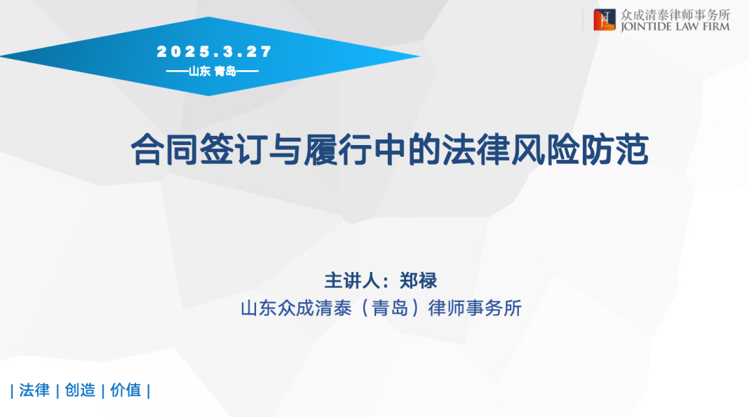 近日,山东众成清泰(青岛)律师事务所律师郑禄受邀为顾问单位青岛市民用建筑设计院有限公司以《合同签订与履行中的法律风险与防范》为题,进行法律培训分享。