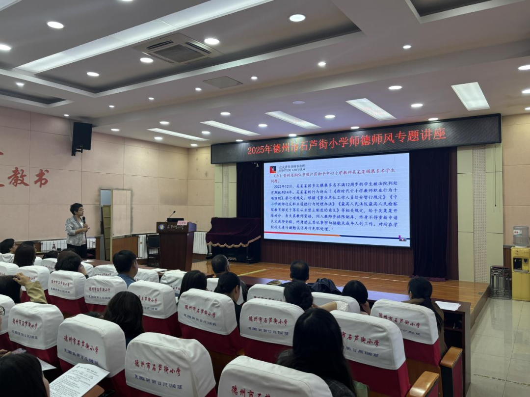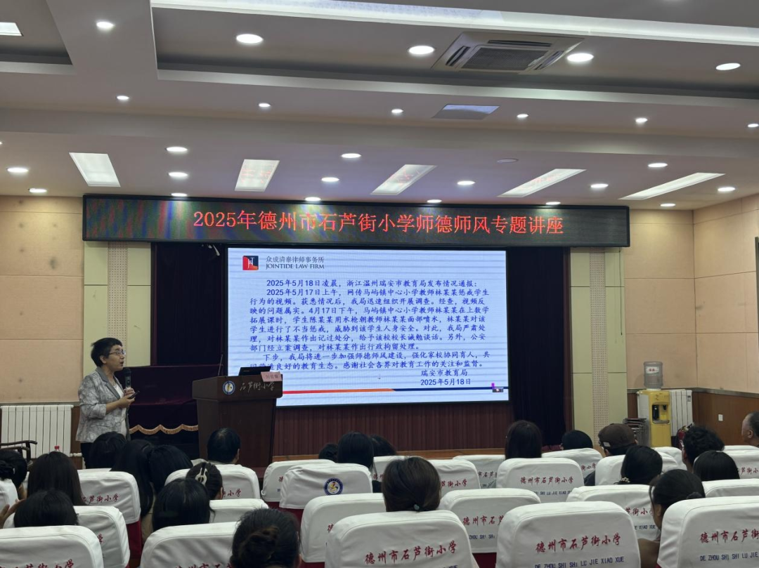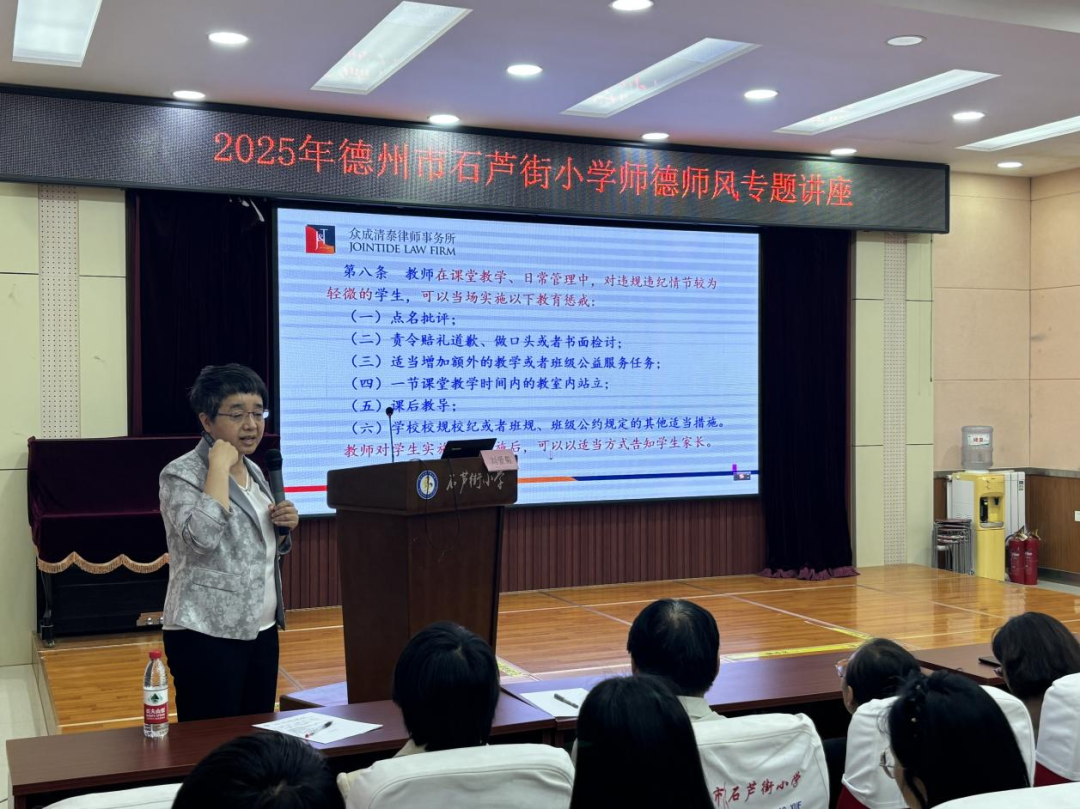 5月23日下午,山东众成清泰(德州)律师事务所刘爱菊律师应德州市石芦小学邀请,为该校全体教职工开展了以“依法执教 建设平安校园”为主题的专题普法讲座,通过案例解析与实务指导,助力校园法治化、规范化管理。