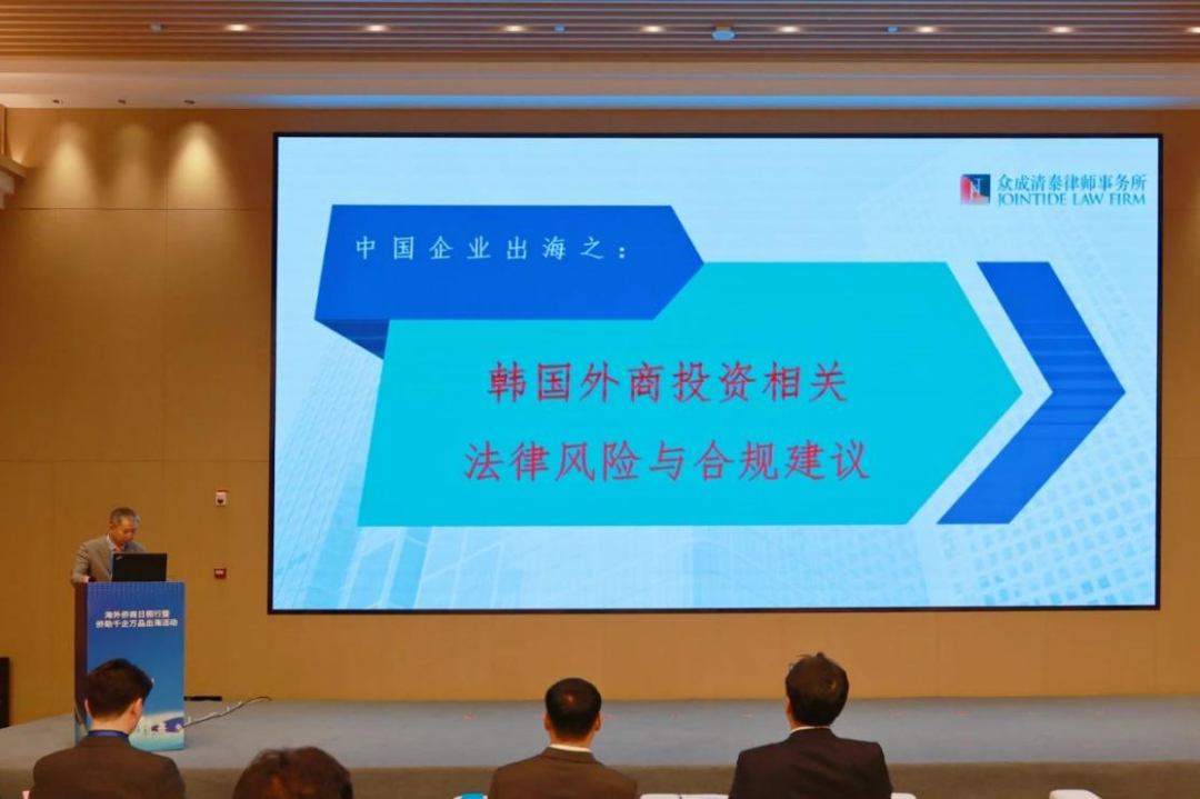 ▲众成清泰韩国所受邀参加海外侨商日照行暨侨助千企万品出海活动 韩国跨境电商企业协会、韩国最大快递公司韵达速递株式会社、韩国最大电商平台Coupang等近30家韩国、马来西亚等海外知名侨商侨企代表齐聚黄海之滨,深入考察产业优势,对接合作项目,助力省内企业出海拓市。 在23日“海外侨商日照行暨侨助千企万品出海”活动的主题讲座环节,众成清泰韩国所主任金允国做“韩国外商投资相关法律风险与合规建议”演讲。他指出,在韩国外商投资过程中,了解并遵守中国法律法规至关重要。金允国详细分析了外商投资可能面临的各种法律风险,并提出了相应的合规建议,为参会侨商侨企提供了宝贵的法律指导。 众成清泰韩国所的其他成员也积极参与了活动的各个环节,与参会代表进行了深入的交流与探讨。他们不仅展示了众成清泰韩国所在法律服务领域的专业实力,还积极寻求与海外侨商侨企的合作机会,为推动中韩经贸合作贡献了自己的力量。 ▲海外侨团潍坊行暨“侨助千企万品出海”活动在峡山生态会客厅举行 活动期间,众成清泰韩国所还与多家侨商侨企达成了初步合作意向,未来将在法律服务、投资合作等领域开展更加深入的合作。此次活动不仅加深了众成清泰韩国所与海外侨商侨企的联系,还为推动中国企业的国际化进程提供了有力的支持。