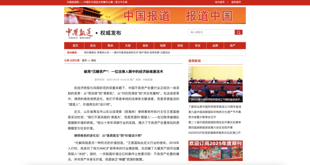 6月4日,国家级媒体《中国报道》关注众成清泰,刊发西海岸所执行主任王恩国专访稿件《破局“沉睡资产”:一位法律人眼中的经济脉络激活术》。深入探讨了王恩国对于如何激活“沉睡资产”的独特见解,以及他在法律实践中的创新方法。