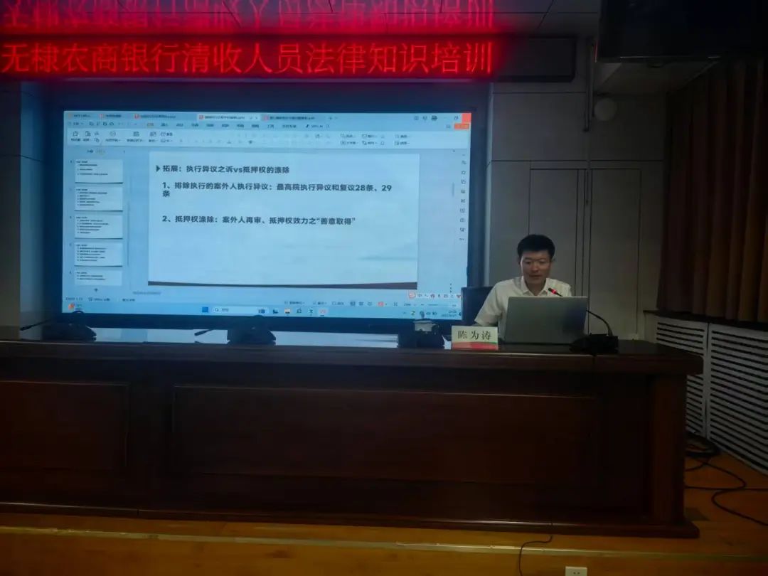 近日,众成清泰潍坊所高级合伙人陈为涛走进无棣农商银行,开展主题为“金融债权执行与抵押物处置法律难点解析”的专项法律宣讲。加强银行从业人员对金融法律实务的理解,提升风险防范能力。
