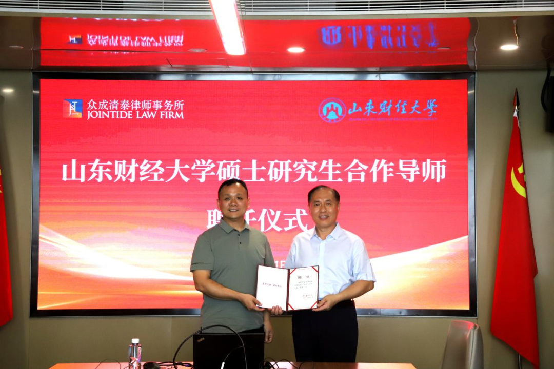 一行人在众成清泰济南所人力资源执委会主任邓璞律师的带领下参观了律所,帮助实习生们对未来1个月的实习工作环境有了直观感受,也激发了他们对法律实务工作的期待。 参观结束后,双方举行了座谈交流。众成清泰副主任孟凡湖对山东财经大学师生的到来表示热烈欢迎,并详细介绍了律所的业务范围、团队建设、青年律师培养等方面的情况,展现出律所深厚的专业底蕴与蓬勃的发展活力。山东财经大学法学院党委副书记沙林斌则介绍了学院的学科建设、人才培养模式以及此次实习的目的与期望,强调希望通过此次实习,让学生们将理论知识与实践相结合,提升专业素养与实践能力。 随后,参与实习的学生们依次进行了自我介绍,表达了对此次实习机会的珍惜,他们青春洋溢的精神风貌与积极进取的态度,赢得了律所与会人员的一致认可。 在本次见面交流会上,还举行了山东财经大学硕士研究生合作导师聘任仪式。山东财经大学正式聘任孟凡湖主任为硕士研究生合作导师。这一举措不仅体现了学校对孟凡湖主任专业能力与行业影响力的高度认可,也标志着双方在人才培养领域的合作进一步深化。未来,孟凡湖主任将凭借其丰富的法律实务经验,为山东财经大学法学院研究生的培养提供更多专业指导与实践建议,助力学院培养出更多高素质、复合型法律人才。 此次见面交流会的成功举办,为山东财经大学法学院与众成清泰济南所搭建了良好的沟通桥梁,为后续两个月的实习工作奠定了坚实基础。相信在双方的共同努力下,实习生们能够在此次实习中收获满满,在法律实践的道路上迈出坚实的一步,为法律行业的发展注入新的活力。