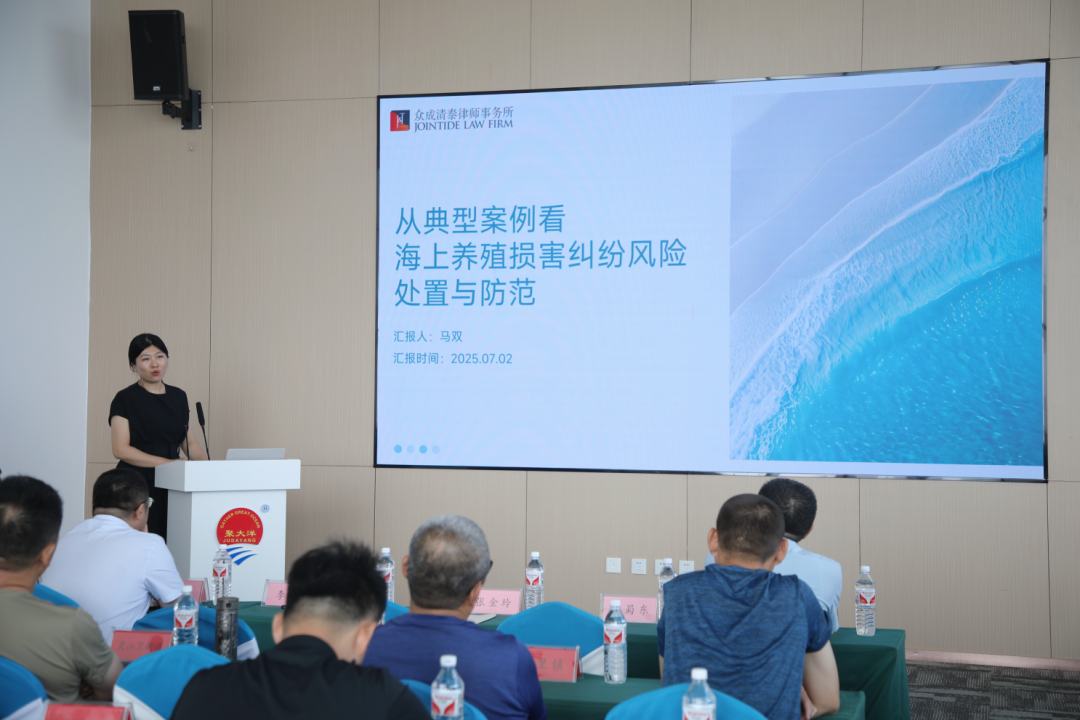 青岛西海岸新区海洋发展局副局长孙蜀东在讲话中指出,新区企业要“未雨绸缪”,主动适应新形势,将政策红利转化为发展动能,实现高质量发展。为破解企业发展难题,区海洋发展局联合多方力量,精心筹备本次培训,聚焦保险护航、金融助力、法律固本三大核心,旨在提升企业风险应对能力,推动新区渔业高质量发展。 马双律师围绕《海上养殖损害纠纷风险防范》进行了专题分享。通过对典型案例的逐帧分析,剖析养殖损害纠纷的常见法律风险,助力企业规避合规风险、模拟纠纷处置、实现稳健经营。