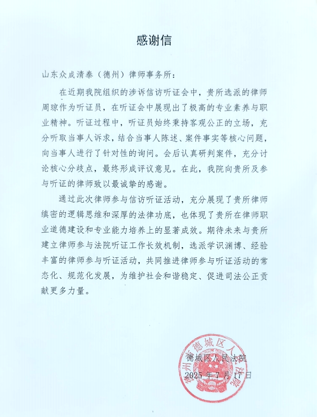 近日,德州市德城区人民法院向众成清泰律师事务所高级合伙人、德州所证券与投融资法律事务部主任周琼律师发来一封感谢信,对其作为听证员参与法院相关听证工作所展现出的高度专业素养与职业精神表示诚挚谢意。