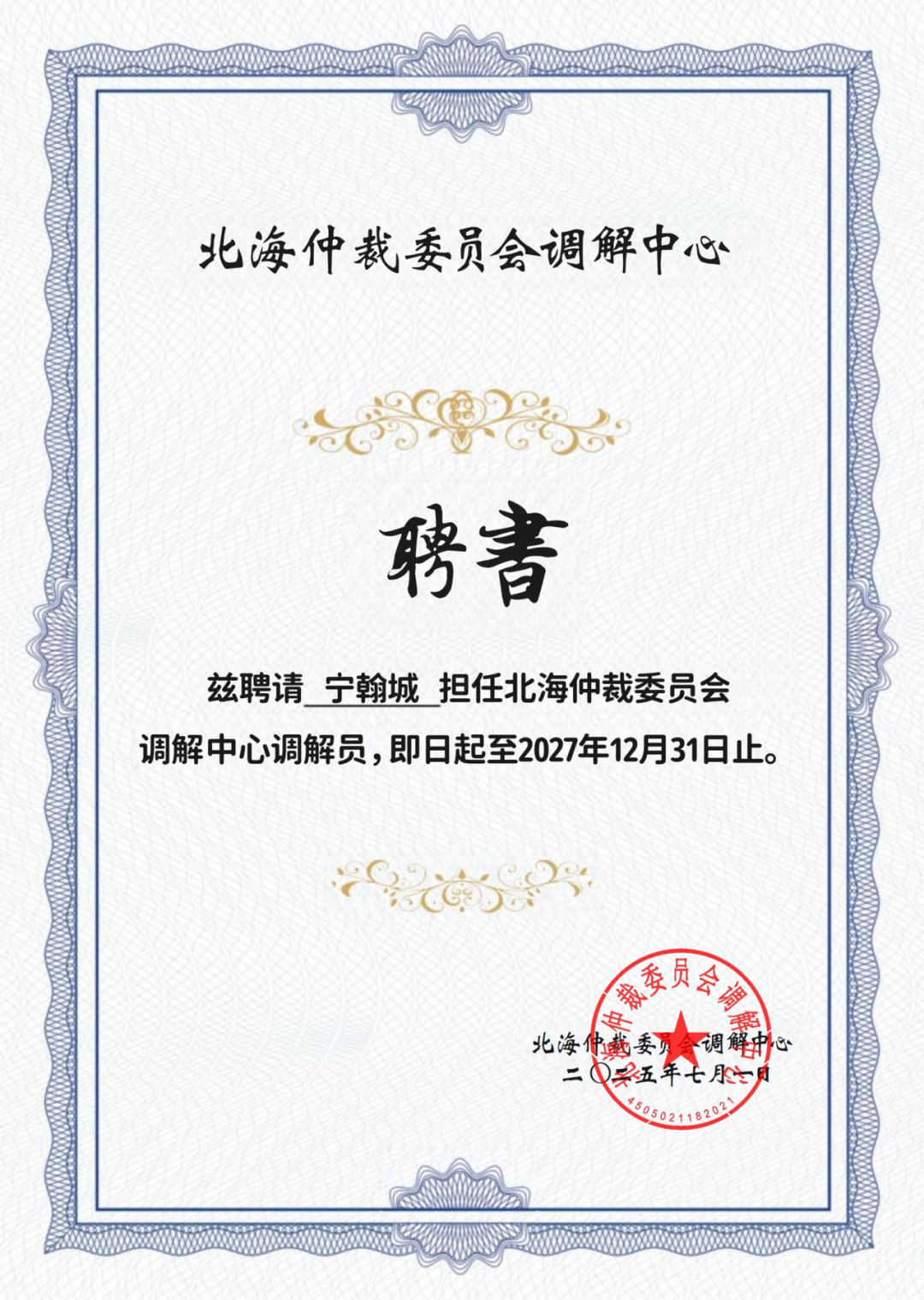 近日,众成清泰青岛所宁翰城律师获聘担任北海仲裁委员会调解中心调解员,任期自2025年7月1日至2027年12月31日。