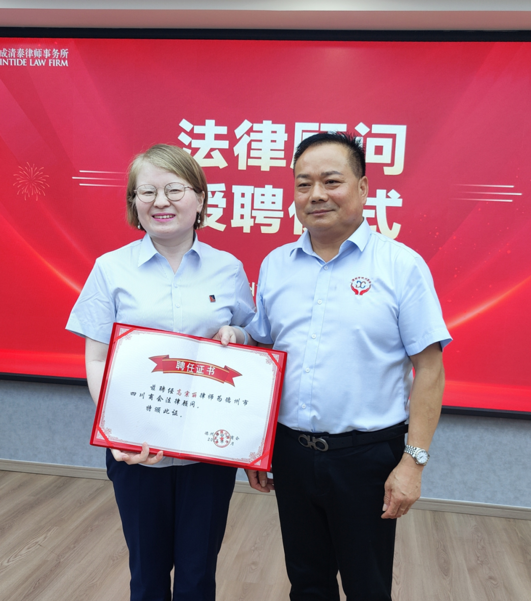 德州市四川商会会长田宾一行参观了党建工作室、“党建+公益”文化长廊、调解室、模拟法庭及员工活动室等特色功能区,并观看了律所党建宣传片。田宾会长一行对众成清泰德州所党建工作与律所专业化发展的深度协同融合给予了高度评价和充分肯定。 德州市四川商会会长田宾与众成清泰德州所高级合伙人周琼在会晤中分别致辞。 双方基于共同愿景,就下一步深化战略合作进行了前瞻规划与务实探讨,明确将在资源共享、优势互补基础上,协同推进具体合作项目的落地实施。 签约仪式上,众成清泰德州所高级合伙人邵岩与德州市四川商会会长田宾共同签署了《战略合作协议》,标志着双方正式建立全面、紧密、长期的法律服务合作关系。众成清泰德州所将依托其在企业合规、商事争议解决、投融资等领域的专业优势,为德州市四川商会及其会员企业提供全方位、高质量的法律支持与服务。 同时,为更高效、专业地满足商会及会员企业的日常法律需求,德州市四川商会正式聘任山东众成清泰德州所合伙人高宗丽担任商会常年法律顾问。高宗丽律师在企业法律风险防控、民商事诉讼及非诉业务方面经验丰富,将切实履行顾问职责,为商会规范运作及会员企业稳健发展保驾护航。
