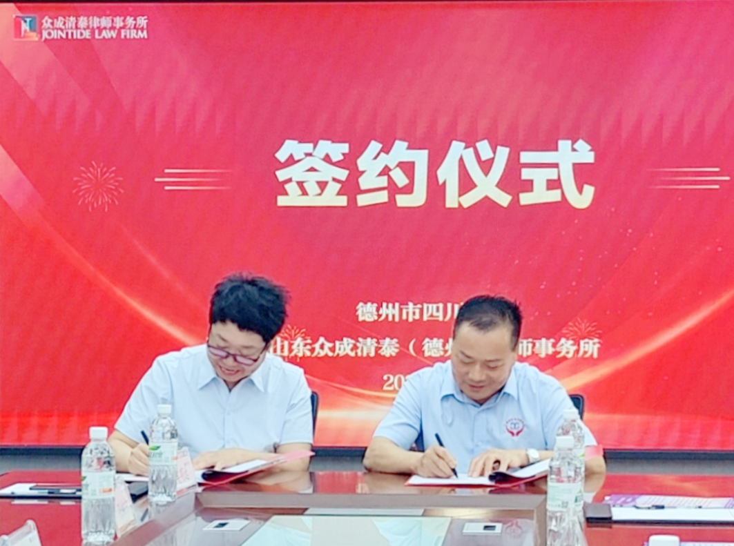 为共同提升法治化营商环境,精准服务在德川籍企业发展,7月23日,山东众成清泰(德州)律师事务所(以下简称“众成清泰德州所”)与德州市四川商会成功举行战略合作签约仪式。签约仪式由众成清泰德州所副主任吴明远主持,德州市四川商会会长田宾、书记蒋泽军、副书记叶达彬、秘书长陈胜银、副秘书长郭川辉与众成清泰德州所高级合伙人周琼、邵岩,合伙人翟秀娟、高宗丽,专职律师柴远洋、张栋宁出席。