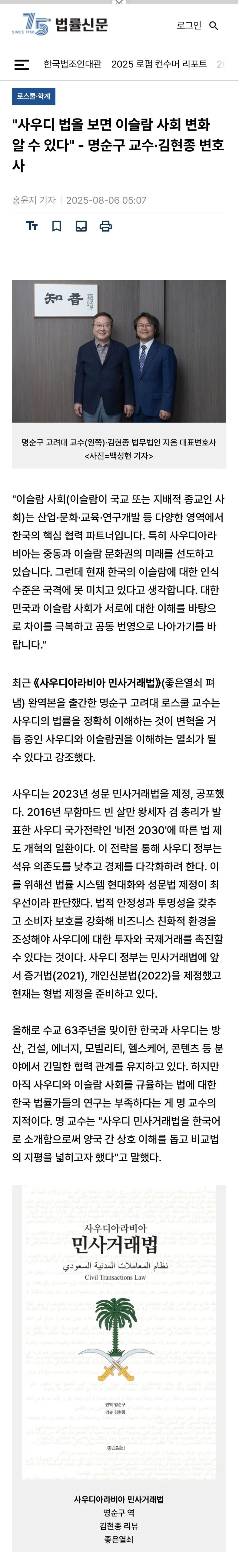 《沙特阿拉伯民事交易法》 近日,明教授新作《沙特阿拉伯民事交易法》韩文版正式出版,中文版也在积极推进中。该书系统梳理了沙特阿拉伯最新的民事交易法律制度,详细解析了合同、物权、担保、责任等关键制度的结构与适用,为学界与实务界深入理解沙特法律提供了一手资料。该著作不仅凝聚其研究的结晶,也填补了国内该领域研究的空白。 未来,本所将继续依托明教授等专家顾问的智识支持,持续推动中外法律文化交流与互鉴,助力企业在复杂多变的国际舞台上稳健前行。 以下为媒体报道的中文翻译: “伊斯兰社会(以伊斯兰为国教或主导宗教的社会)在产业、文化、教育、研发等诸多领域,都是韩国的重要合作伙伴。尤其是沙特阿拉伯,正引领中东和伊斯兰文化圈的未来。然而,我认为目前韩国社会对伊斯兰的认知水平尚未达到与国格相符的高度。希望韩国与伊斯兰社会能够在相互理解的基础上,克服差异,共同迈向繁荣。” 近日出版了《沙特阿拉伯民事交易法》(由“好钥匙”出版社发行)全译本的高丽大学法学院教授明淳龟强调,准确理解沙特法律,是理解不断经历变革的沙特及伊斯兰世界的关键。 沙特在2023年制定并公布了成文《民事交易法》,这是根据王储兼首相穆罕默德·本·萨勒曼于2016年提出的国家战略“2030愿景”所进行的法律制度改革的一部分。通过这一战略,沙特政府试图降低对石油的依赖,实现经济多元化。为此,法律体系的现代化和成文法的制定被认为是首要任务。只有在具备法律稳定性和透明性的前提下,加强消费者保护,才能营造有利于商业的环境,从而促进对沙特的投资和国际交易。在《民事交易法》之前,沙特政府已经制定了《证据法》(2021)、《个人身份法》(2022),目前正着手准备《刑法》。 迎来建交63周年的韩国和沙特,在防务、建筑、能源、移动、医疗、内容等多个领域保持紧密合作。然而,韩国法律界对沙特及伊斯兰社会的法律研究仍显不足。明教授指出:“我希望通过将《沙特民事交易法》译介为韩文,帮助两国加深相互理解,拓展比较法的视野。” 《沙特民事交易法》全译本以沙特政府发布的官方英文版为基础,但在英文版中出现部分错误时,参考了阿拉伯语原文。明教授解释说:“仔细研读英文版会发现其中夹杂了一些普通法(common law,英美法系)的思维,与大陆法有所差异,有时甚至会体现为错误。这种情况下,我只能费力查阅阿拉伯语原文来加以纠正。” 明教授强调,理解伊斯兰法律体系时,应当明确区分“伊斯兰法”(Islamic laws,即沙里亚)与“伊斯兰社会的法律”(laws in Islamic society)。前者是伊斯兰教的宗教规范(律法),而后者则是我们通常意义上理解的世俗法律。虽然两者并非全然无关,但《民事交易法》属于后者领域,其体系与内容大多与我们熟悉的法律相似。 与多数中东和北非国家相同,沙特《民事交易法》深受法国民法影响,并在很大程度上借鉴了1948年制定的《埃及民法》。明教授解释道:“不过,沙特《民事交易法》相比周边国家的民法,融入了更多的沙里亚元素。为便于韩国读者理解,我在译本中增添了大量注释。” 明教授毕业于高丽大学法学院,并在法国巴黎第一大学获得博士学位,是韩国与法国民法领域的权威,同时对伊斯兰世界的法律亦有深入研究。他回忆道:“在巴黎留学期间,我与来自阿拉伯和北非的穆斯林同学交流,才发现我们不仅缺乏对伊斯兰文化的了解,还存在一些不当的偏见。那时我立下目标,要认真研究伊斯兰的法律。”基于这一目标,明教授25年前就在高丽大学研究生院开设了“伊斯兰圈司法理论”课程,并持续钻研至今。2021年,他翻译出版了美国哥伦比亚大学名誉教授约瑟夫·沙赫特(Joseph Schacht)的《伊斯兰法导论》。 明淳龟教授、金贤钟律师合影 此次全译本出版,还得到了拥有15年中东与非洲地区实务经验的金贤钟律师(“知音”律师事务所代表律师)的参与。金律师以实务者视角负责了译本的审阅工作,并由“知音”提供资金支持,协助完成出版。 金律师曾于2010年至2015年间担任LG电子中东·非洲地区总部法务组组长,负责管理30余个国家的法人及分支机构。随后,他主导了太平洋律师事务所迪拜办公室的设立,并于2017年创办了中东·非洲专业律所MEA。2023年,MEA与“知音”合并,目前由他全面统筹海外业务。 金律师强调:“伊斯兰社会覆盖全球约四分之一的人口与国家,尤其中东地区掌握着全球50%以上已探明的石油和天然气储量。”他表示:“希望借由本次全译本的出版,推动社会各界认识到伊斯兰社会的法律在比较法研究中的重要性。同时,期待韩国企业能够勇敢进军中东、非洲、印度、中亚等最后的蓝海市场。” ▲韩国法律新闻进行报道