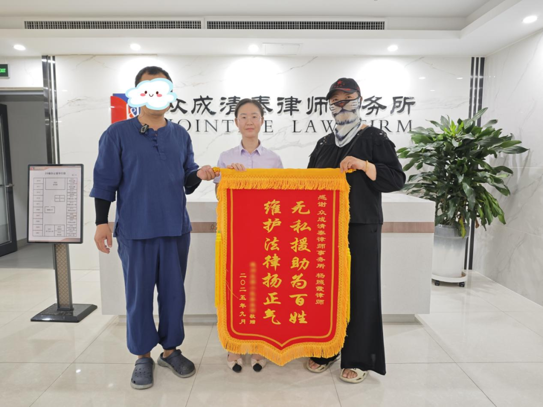近日,山东众成清泰(德州)律师事务所专职律师杨照霞收到了委托人孙先生送来的锦旗,锦旗上“维护法律扬正气,无私援助为百姓”一组金字相映生辉,既是对该律师专业能力的高度认可,又是对律所法律服务品质的充分肯定,更是彰显了法律援助在维护弱势群体合法权益中的重要作用。