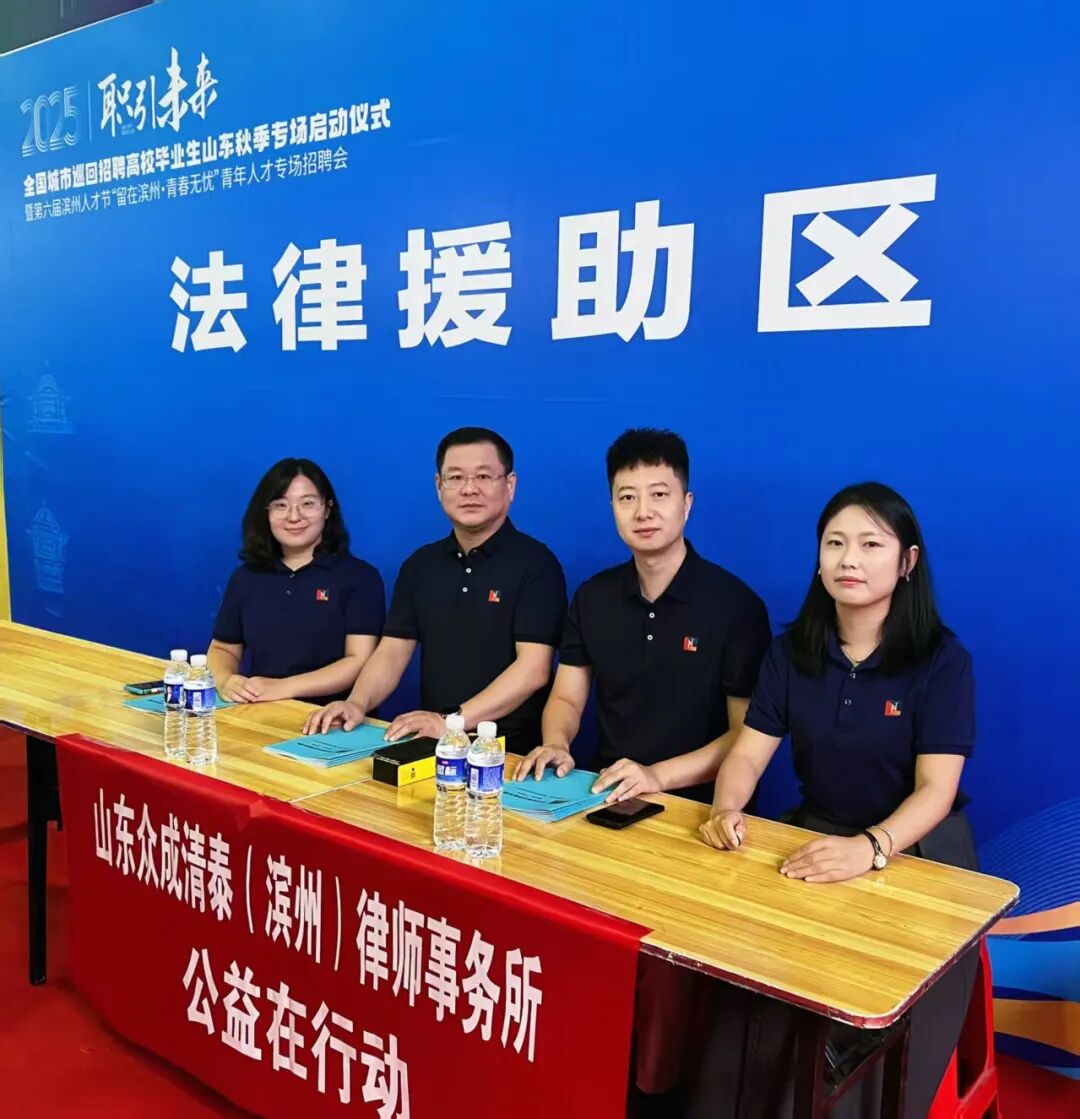 9月19日,由中共滨州市委组织部 、滨州市人力资源和社会保障局主办的第六届滨州人才节暨“留在滨州·青春无忧”青年人才专场招聘会在山东航空学院启幕,招聘会汇聚多家优质企业,吸引了大批青年求职者。众成清泰(滨州)律师事务所戚吉镇、魏星、李倩倩、李昕等党员和青年律师作为律师代表受邀到场为求职者及企业双向提供公益法律服务。