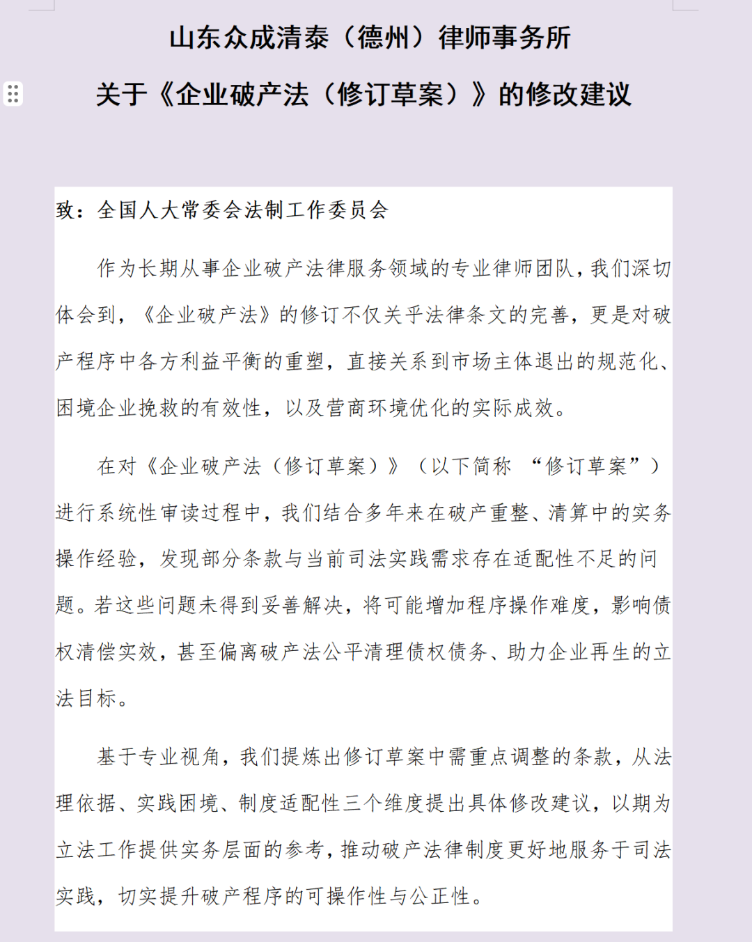 众成清泰(德州)律师事务所破产团队将持续关注《企业破产法》的修订进程,不断提升专业能力,致力于为各类市场主体提供更优质、更精准的破产法律服务,为营造市场化、法治化、国际化的营商环境贡献力量。