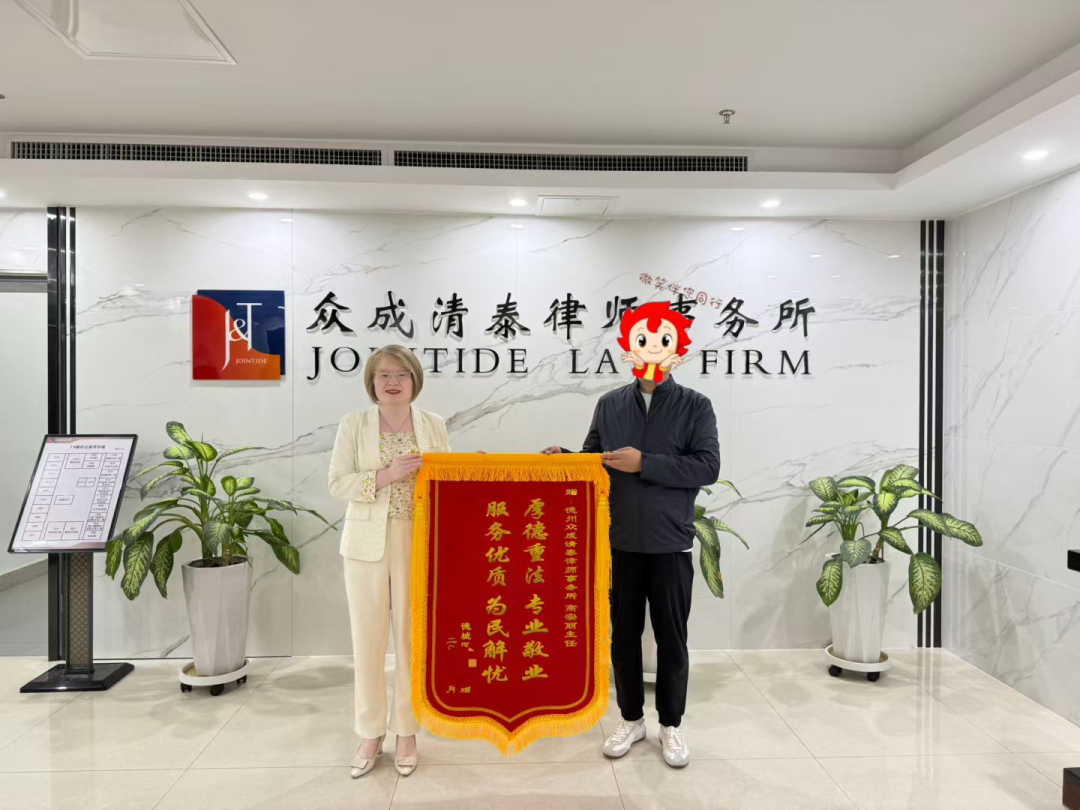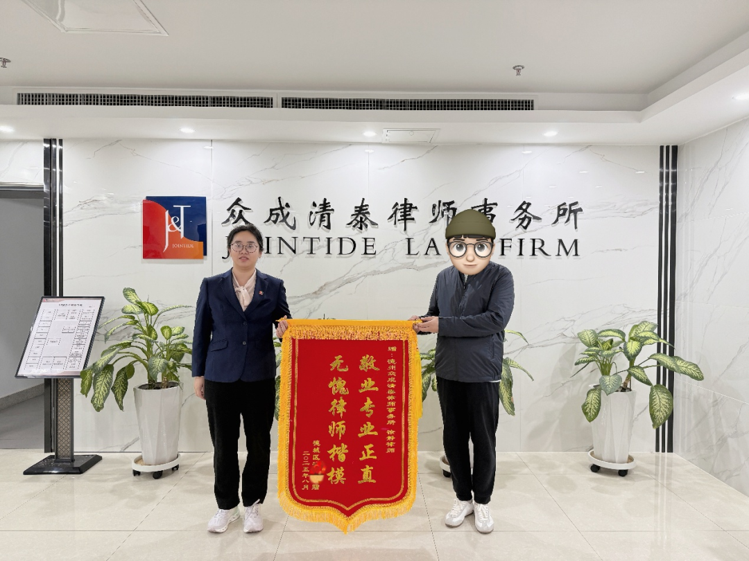 近日,委托人徐先生专程来到山东众成清泰(德州)律师事务所,将两面承载着诚挚谢意的锦旗敬赠给高宗丽、徐静两位律师。锦旗上“厚德重法,专业敬业,服务优质,为民解忧”与“敬业、专业、正直,无愧律师楷模”的烫金大字,不仅是对两位律师卓越专业能力的充分肯定,更是对其恪尽职守、竭力维护当事人合法权益的敬业精神的高度赞誉。