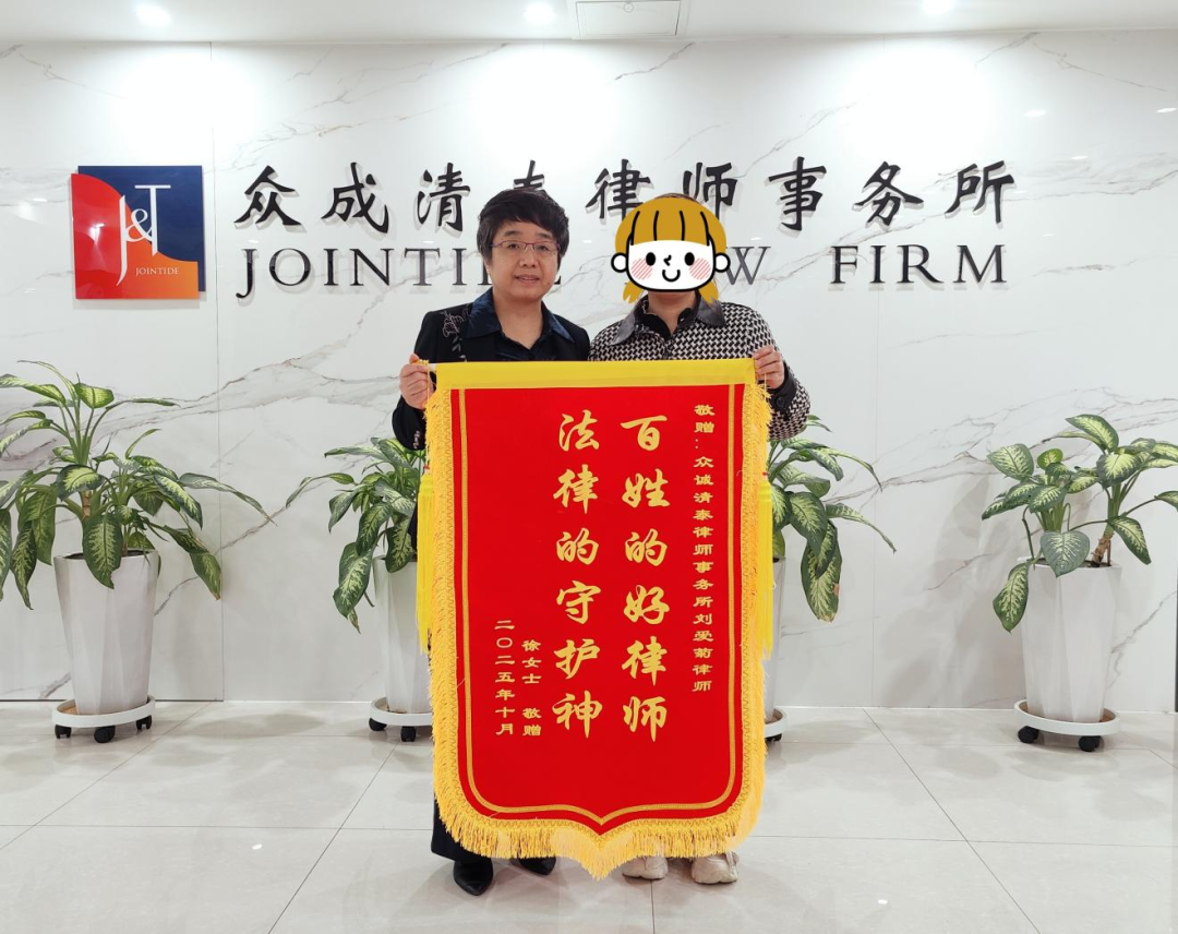 2025年10月15日,委托人徐女士专程到访山东众成清泰(德州)律师事务所,将一面印着“百姓的好律师,法律的守护神”的锦旗,亲手赠送给刘爱菊律师,以此表达对其专业法律服务的由衷感谢。