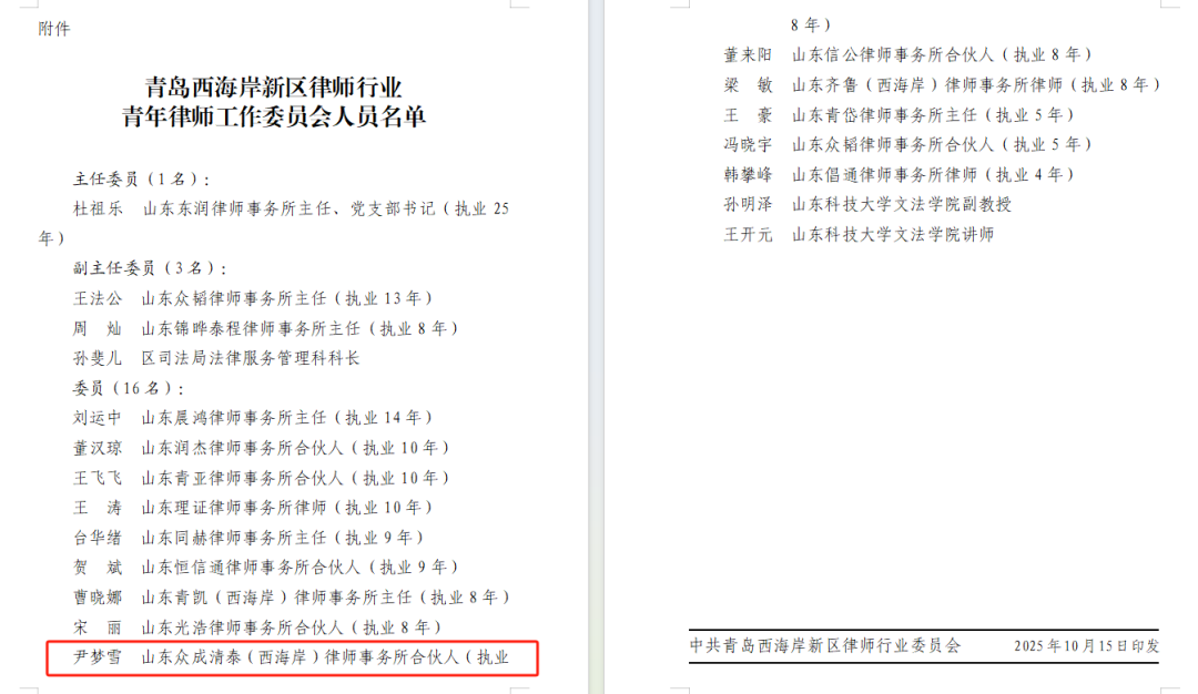 2025年10月15日,中共青岛西海岸新区律师行业委员会下发《关于成立青岛西海岸新区律师行业青年律师工作委员会的通知》,《通知》明确了青工委的人员组成,众成清泰西海岸所尹梦雪律师被评选为青工委委员。