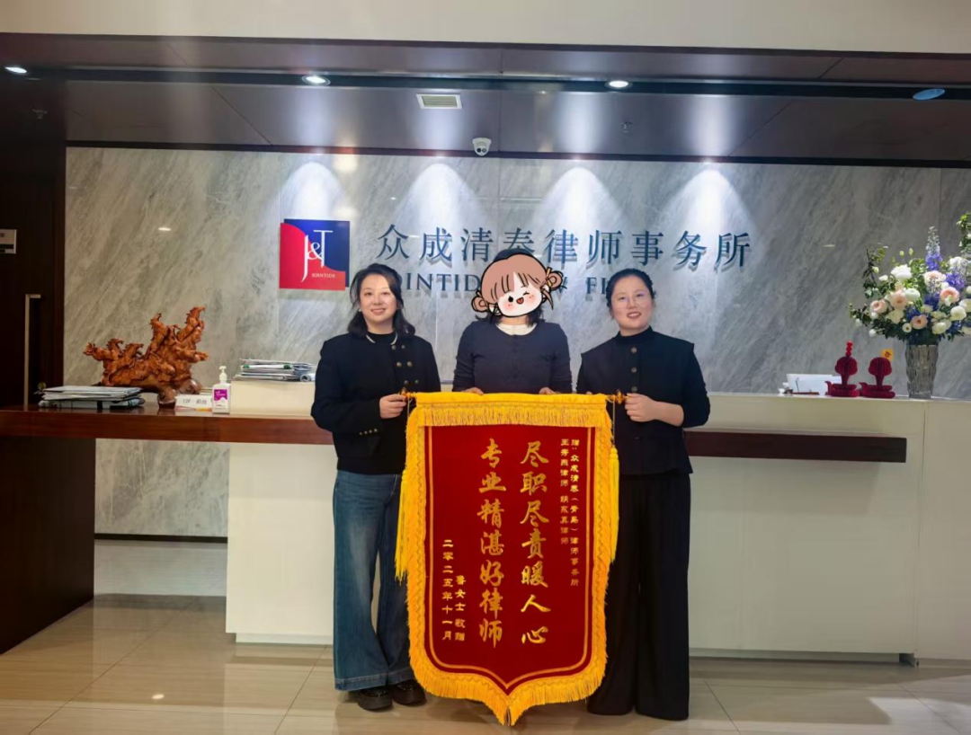 2025年11月4日,鲁女士将一面写有“尽心尽责暖人心 专业精湛好律师”的锦旗送到众成清泰(青岛)律师事务所,以此感谢王秀燕、胡永真律师在代理其离婚纠纷时,不仅提供专业法律服务,更以耐心调解化解矛盾、修复关系的辛勤付出。