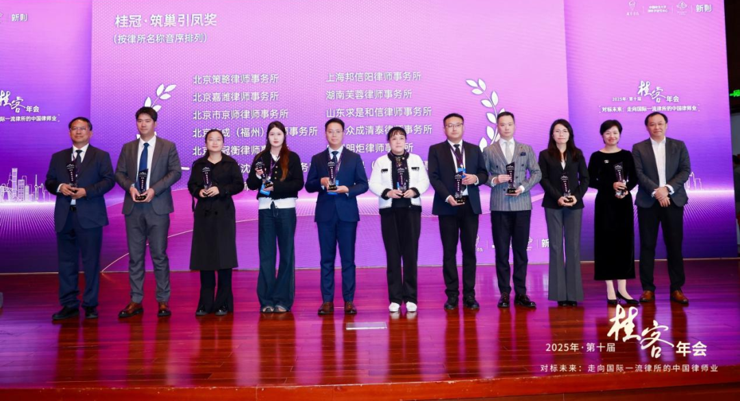 11月8日,备受法律界瞩目的第十届桂客年会在北京隆重举行。本届年会以“对标未来:走向国际一流律所的中国律师业”为主题,汇聚了来自全国各地的律师精英,共同探讨中国律师行业在国际化浪潮中的发展路径与战略机遇。众成清泰律师事务所王琰、崔守旭、邓璞、苏娜四位律师受邀参与此次盛会。众成清泰在年会颁奖典礼上斩获四项殊荣——“中国规模律所百强排名奖”“区域深耕奖”“筑巢引凤奖”及“涉外法治奖”,彰显了律所在规模化发展、区域市场精耕、人才吸引培育以及国际化法律服务能力等方面的卓越实力与领先地位。