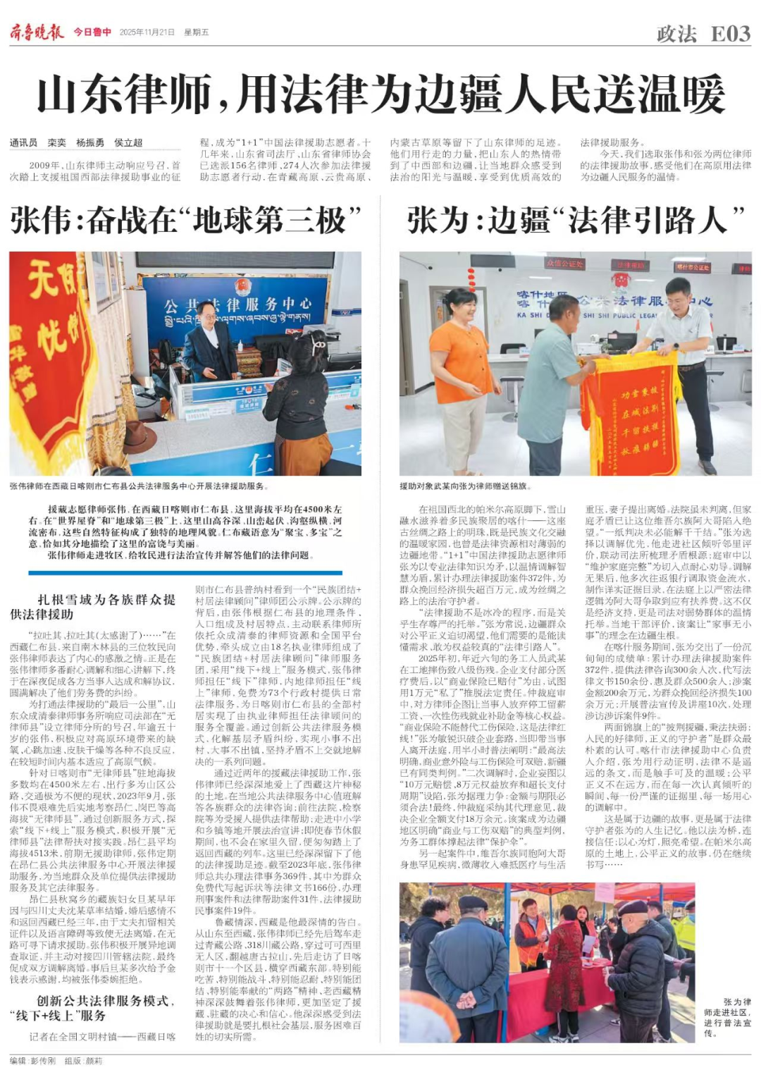 11月21日,《齐鲁晚报》政法专版以《山东律师,用法律为边疆人民送温暖》为题,专题报道了众成清泰律师事务所张伟、张为两位律师扎根高原、服务边疆的感人事迹,展现了我所律师在法律援助一线的责任与担当。