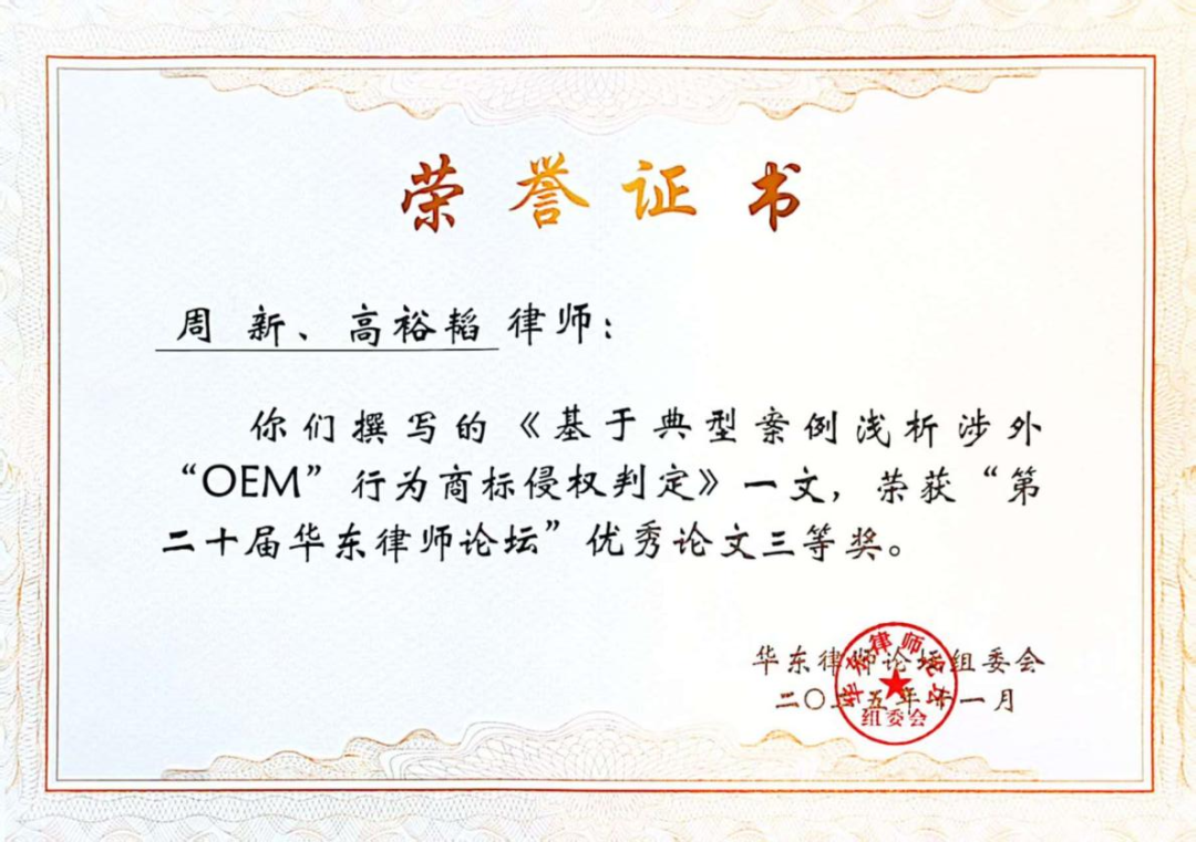 本次论坛设立党建引领律师行业发展新征程、新质生产力赋能与行政法律服务创新、民营经济高质量发展的刑事司法保障和辩护代理工作、民商法治新趋势与金融证券法律业务数字化转型、全球视野下的跨境法律服务等五个分论坛,并集结成册论文105篇。 经过专家评选,周新、高裕韬律师撰写的《基于典型案例浅析涉外“OEM”行为商标侵权判定》一文荣获“第二十届华东律师论坛”优秀论文三等奖。 此次论坛为华东地区律师搭建了思想碰撞、经验分享的交流平台,受邀参加本次论坛充分展现了本所律师实务与理论研究并举的丰硕成果。未来,潍坊所将继续鼓励律师秉承“实务与理论,两手抓、两手都要硬”的精神,为推动律师行业在新形势下高质量发展、法治中国建设作出更大贡献。