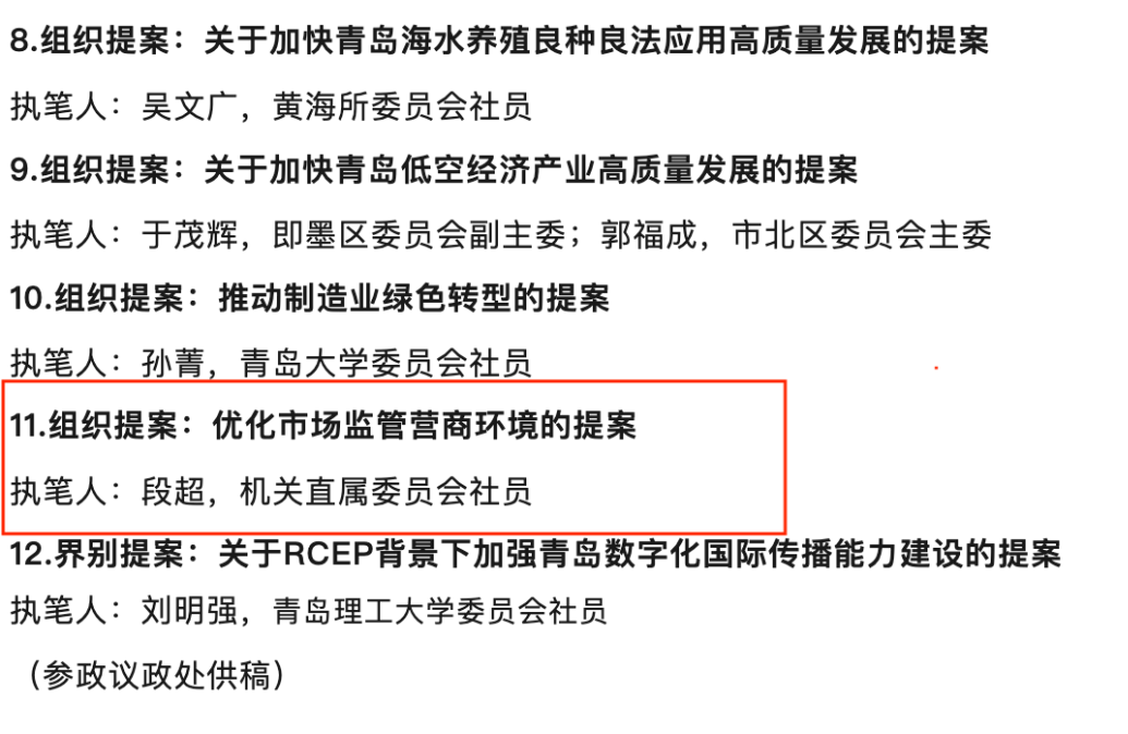 参政议政 | 合伙人会议主席段超《关于进一步深化“服务型执法”优化市场监管营商环境的建议》获青岛政协第十四届第五次会议正式批准立案