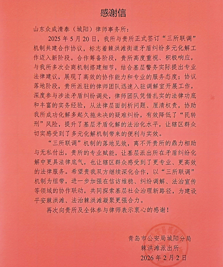近日,青岛市公安局城阳分局棘洪滩派出所向山东众成清泰(城阳)律师事务所发来感谢信,对律所深度参与“三所联调”机制共建、助力基层矛盾纠纷多元化解工作给予高度肯定。