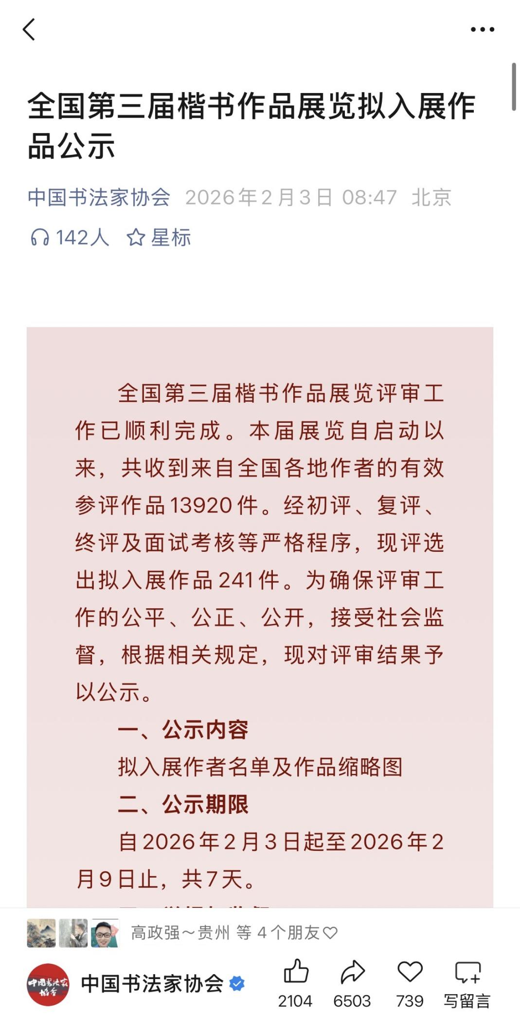 2026年2月3日,中国书法家协会发布全国第三届楷书作品展拟入展名单,众成清泰青岛所高争律师创作的书法作品《东坡题跋五则》成功入展。作为入展作者,高争律师同时具备加入中国书法家协会的条件之一。