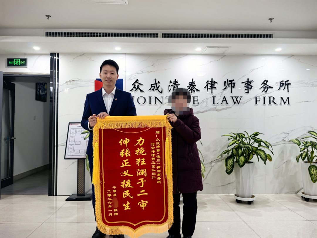 近日,当事人张某将一面写有“力挽狂澜于二审、伸张正义援民生”的锦旗送至山东众成清泰(德州)律师事务所,以此表达对付宏伟律师在代理其土地承包经营权纠纷案件过程中的专业服务与辛勤付出的诚挚感谢。