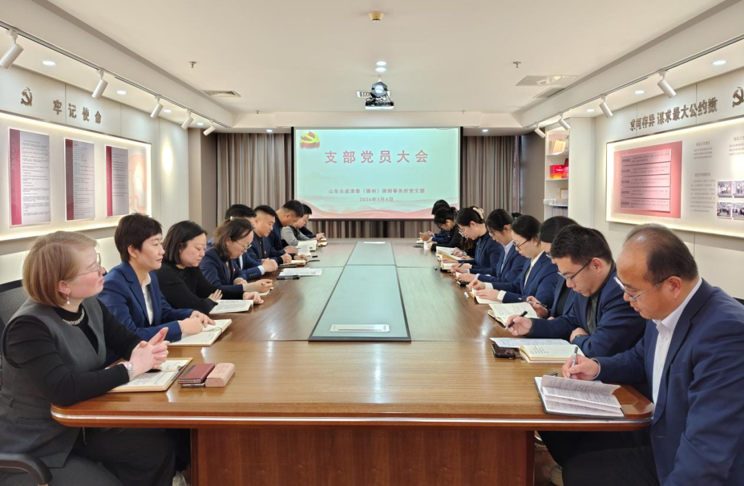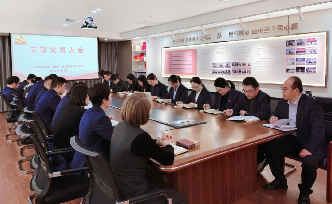 2026年3月4日,山东众成清泰(德州)律师事务所党支部召开全体党员大会,深入学习贯彻习近平法治思想,传达学习上级机关有关会议精神,并安排部署2026年度党支部重点工作。会议由党支部专职副书记李建华主持,党支部书记魏金辉及在所党员、入党积极分子参加。