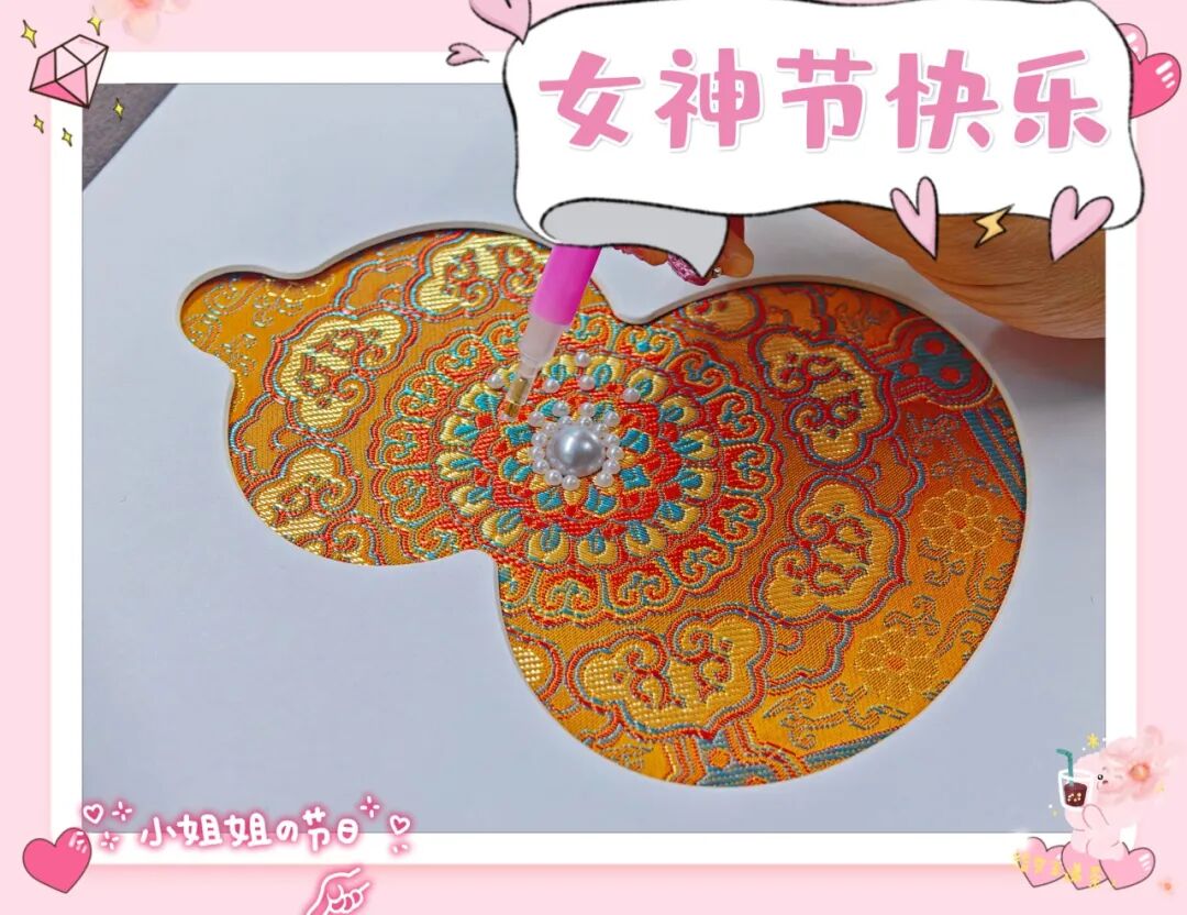 红包带来的喜悦尚未散去,活动转入匠心独运的手作时光。大家开始体验制作"宋锦珍珠画",此项活动融合传统工艺与现代美学的创意手作。宋锦,素有"锦绣之冠"的美誉,纹理细腻,色彩古雅;珍珠,温润如玉,光泽莹莹。平日里伏案执笔,唇枪舌战的律政佳人们,此刻静下心来,以锦为纸,以珠为墨,精心构图,细心镶嵌。一颗颗圆润的珍珠点缀于精致的宋锦之上,或成花蕊,或作星辰,方寸之间尽显巧思。大家相互交流配色技巧,分享创作灵感,一件件独一无二的作品在指尖悄然绽放,不仅定格了春日的美好,更将温柔与坚韧藏进了每一寸纹理之中。