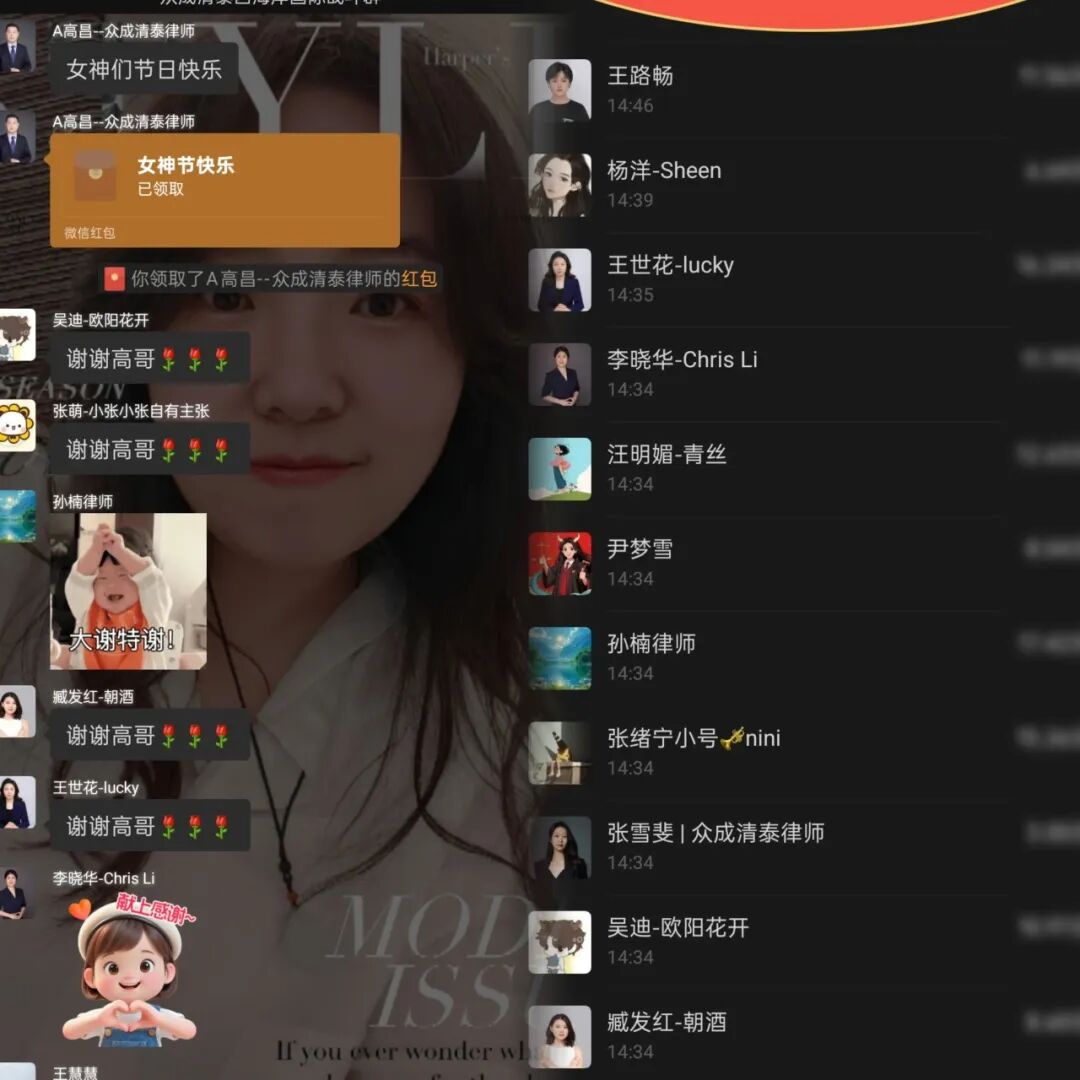 活动伊始,单伟顾问亲临现场,为每位女律师赠送了精心挑选的书籍,并致以节日的诚挚祝福。单伟顾问表示:"法律工作既需要理性的锋芒,也离不开感性的滋养。希望女律师们以书为伴,在阅读中丰盈内心,涵养气质,既有专业的高度,也有生活的温度,并倡导让阅读成为一种生活方式。"接过飘着墨香的书籍,大家备受鼓舞,纷纷表示要在忙碌工作之余坚持阅读,做知性优雅的新时代法律人。一本本赠书,承载着律所、单伟顾问对女性同胞的殷切期许,也为本次活动拉开了温馨的序幕。 书香浸润之后,活动现场迎来了一波“惊喜时刻”。西海岸所主任高昌在群内发出节日红包,为全所女同胞送上诚挚的祝福。伴随着清脆的红包提示音,“女神节快乐”“谢谢主任”的留言在群内不断刷屏。大家一边分享着收到红包的喜悦,一边互相道贺,欢声笑语此起彼伏,将现场气氛推向高潮。这份“指尖上的温暖”,让节日的喜悦在线上线下同步传递,更添一份热闹与温馨。