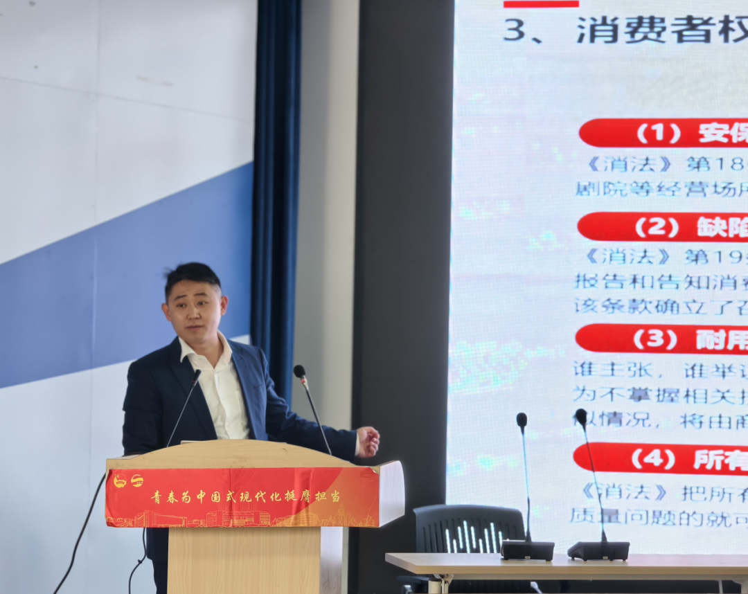 专家讲堂:以案说法,干货满满 在热烈的氛围中,特邀嘉宾王恩国律师登台,为大家带来了一场精彩纷呈的主题讲座。王恩国律师结合多年实务经验,紧扣大学生日常消费场景,讲座以《消费者权益保护法》概述、消费者权益解读、争议解决实务三大板块为脉络,层层递进、深入浅出。从“职业打假人是否属于消费者”,到“二手交易纠纷能否适用消费者保护规定”,再到面对商家不合理要求时如何合法维权,王恩国律师以鲜活真实的典型案例为切入点,将抽象法条转化为易懂、好用、易记的实用知识,让法律真正走进校园、贴近生活。 他特别提醒同学们:日常消费务必妥善留存购物凭证、聊天记录、支付截图等关键证据;遇到消费纠纷时保持理性冷静,优先协商沟通,同时善用12315投诉举报平台及法律途径维护自身合法权益。整场讲座中,同学们认真聆听、积极思考,不时低头记录重点内容,眼神中满是对法律知识的渴求与学习热情,现场学习氛围浓厚。 有奖竞答:寓教于乐,气氛热烈 讲座结束后,进入了备受期待的有奖知识竞答环节。答对问题的同学收获了精美小礼品,喜悦之情溢于言表。现场欢声笑语不断,消法知识悄然入脑入心。 圆满落幕:定格瞬间,展望未来 在主持人的总结致谢中,本次消费者权益守护讲堂缓缓落下帷幕。随后,全体工作人员与嘉宾走上台前,在镜头前留下了灿烂的合影。 此次讲堂内容丰富、形式活泼,既有理论高度,又具实践温度,切实提升了同学们的消费维权能力,进一步浓厚了校园法治文化氛围,成功搭建起了从课本理论到司法实践的桥梁。