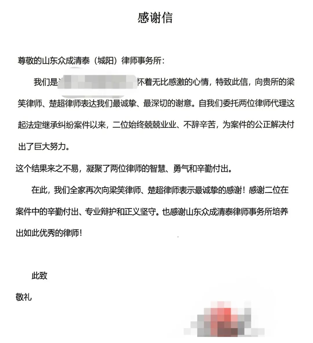 这起法定继承纠纷案件,背后是一场通过法律途径维护公平正义的“维权之争”。 涉案房屋建于三十多年前,两位律师自接受委托后,多次往返于派出所、村委及多个政府部门之间,调取笔录、查阅尘封档案、固定证人证言。楚超律师与梁笑律师默契配合,团队反复研讨案件细节,精准研判法律适用,制定了周密的诉讼策略,庭前精准预判对方的多项抗辩理由及可能出现的质证焦点,庭审中沉着应对、逻辑清晰,有力地驳斥了对方主张,全力维护当事人权益。 当事人在感谢信中写道:“这个结果来之不易,凝聚了两位律师的智慧、勇气和辛勤付出。” 锦旗无言,纸短情长。为每一位当事人守住公平正义的底线,便是律师最闪亮的勋章。未来,众成清泰城阳所将继续坚守法治信仰,以专业赋能维权,以责任守护公平,直面复杂案件、破解维权难题,用实际行动践行法律人的初心与使命,守护每一位当事人的合法权益,让正义不缺席、温暖不缺位!
