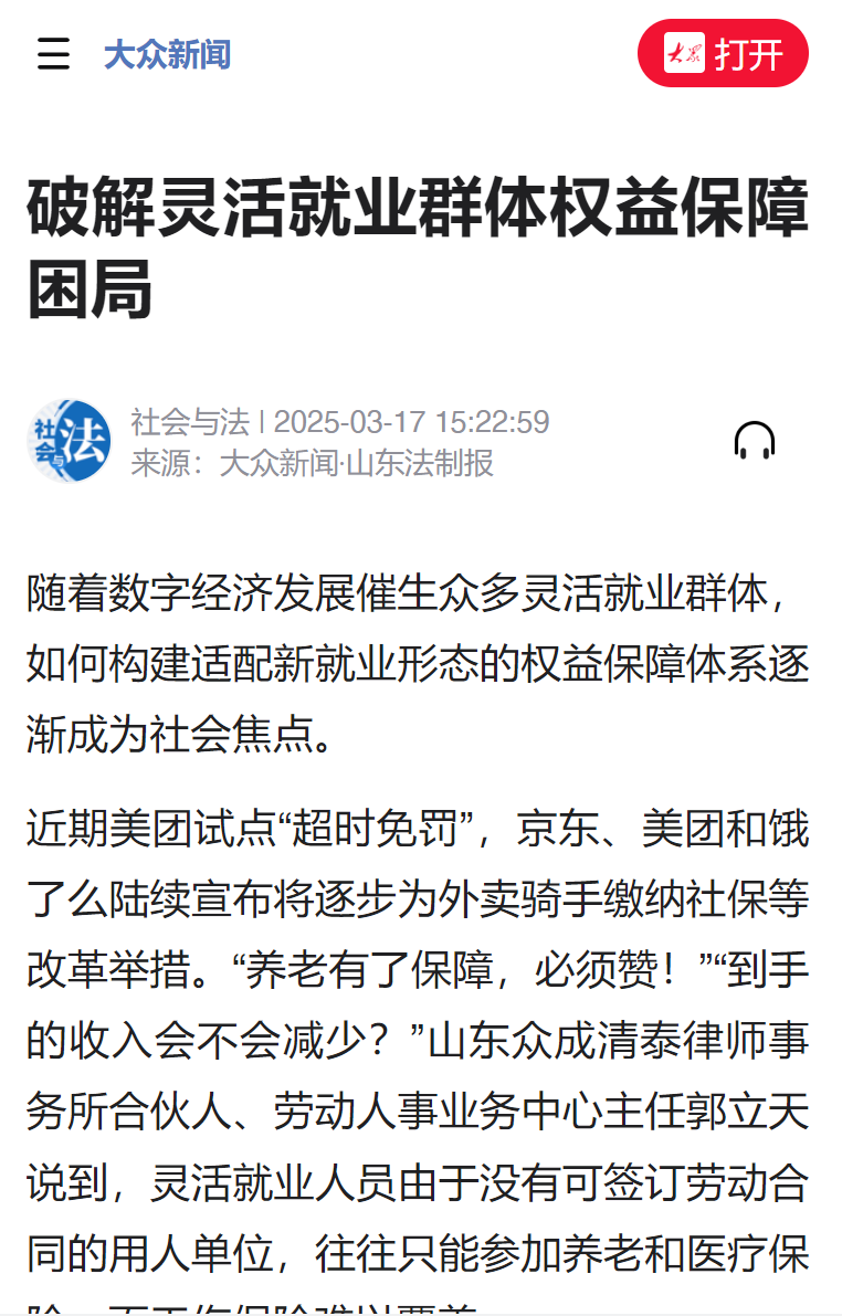 以下为报道全文: 随着数字经济发展催生众多灵活就业群体,如何构建适配新就业形态的权益保障体系逐渐成为社会焦点。 近期美团试点“超时免罚”,京东、美团和饿了么陆续宣布将逐步为外卖骑手缴纳社保等改革举措。“养老有了保障,必须赞!”“到手的收入会不会减少?”山东众成清泰律师事务所合伙人、劳动人事业务中心主任郭立天说到,灵活就业人员由于没有可签订劳动合同的用人单位,往往只能参加养老和医疗保险,而工伤保险难以覆盖。 在调查中发现,灵活就业群体呈现显著风险差异:外卖骑手交通事故率是普通劳动者的3.2倍,建筑零工职业病发生率超行业平均水平40%,而自由设计师群体心理焦虑检出率达29%。这种风险图谱倒逼保障体系走向精细化。 实际上,“超时免罚”措施能够给予骑手更多的容错空间和安全保障。郭立天说道:“由于送餐超时会影响绩效,骑手压力大,为赶时间会出现许多不规范行为,不利于行业发展,美团将超时扣款’改为积分制是积极信号。”他认为,平台考核机制不能直接引入罚款形式,而是要建立量化标准,并且积分的增扣须与绩效、工资形成完善机制。同时,员工关系管理不限于劳动关系,外卖平台应注重员工关怀,也应适当征求消费者意见,将员工关怀与消费者体验相结合,平衡两者关系。 “在灵活就业人员群体中,依托平台的外卖员和网约车司机、工作内容偏向于重体力的零工劳动者等人群,时常面临较高的职业伤害风险,但又无法加入到传统的工伤保险制度保障中,于他们而言,工伤保险的缴纳需求甚至高于养老保险和医疗保险。”郭立天说。他建议,山东省出台了特定从业人员参加工伤保险政策,用人单位可为超龄人员、实习学生等特定从业人员办理单险种工伤保险。全省可继续扩大工伤保险覆盖范围,更好地维护劳动者工伤权益。(通讯员 王晨恺)
